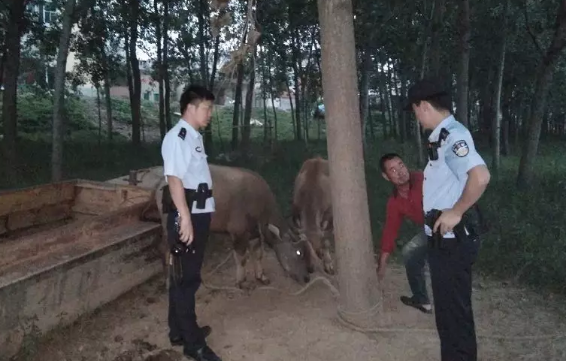 为了帮水牛回家,郎先生只好报警求助。接警后,王家坝派出所民警来到郎先生家中,发现两头水牛是成年牛犊,市价约值两三万元钱。