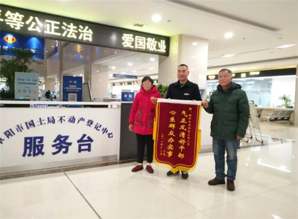 9月14日,新的不动产权证终于办理完毕,发放到丁超手中。12月10日上午,丁超老两口再次来到市不动产登记中心窗口,并带来了一面锦旗,写着“气正风清好干部、心系群众办实事”。